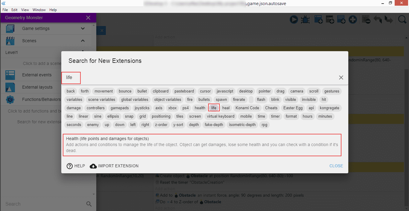 This introduces a behavior called "Health", which we can then manipulate in our game to manage the life of an object. Click "Install in project" to be able to use it.