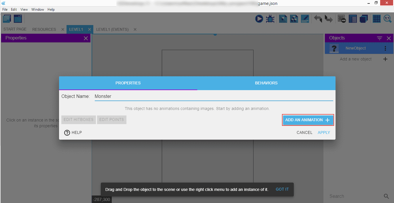 After giving him his new name, let's add some images that will represent him on the scene and in the game. Click on the "Add an animation" button to open a file select window.