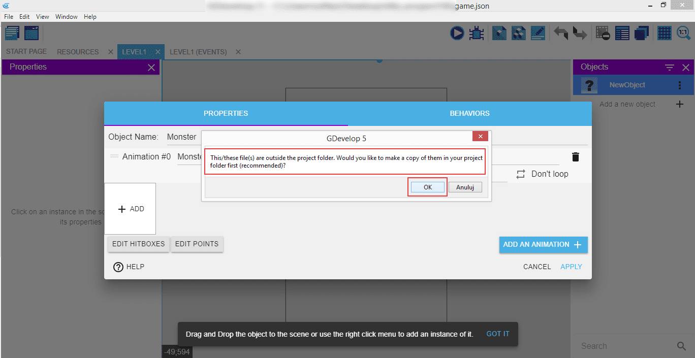 GDevelop will show the message saying those files are outside of the project folder, so the recommended next step is to allow copying them onto the project folder first before we do anything with them. Click "Ok" to do that.