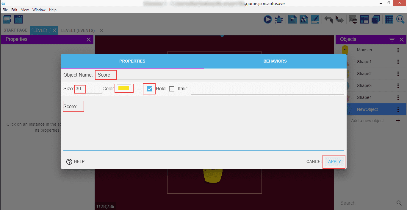 Now enter the properties: "Object Name" is "Score", and we also set the size of the text to 30, color to yellow, and we're making it "bold". The text itself is "Score: ".