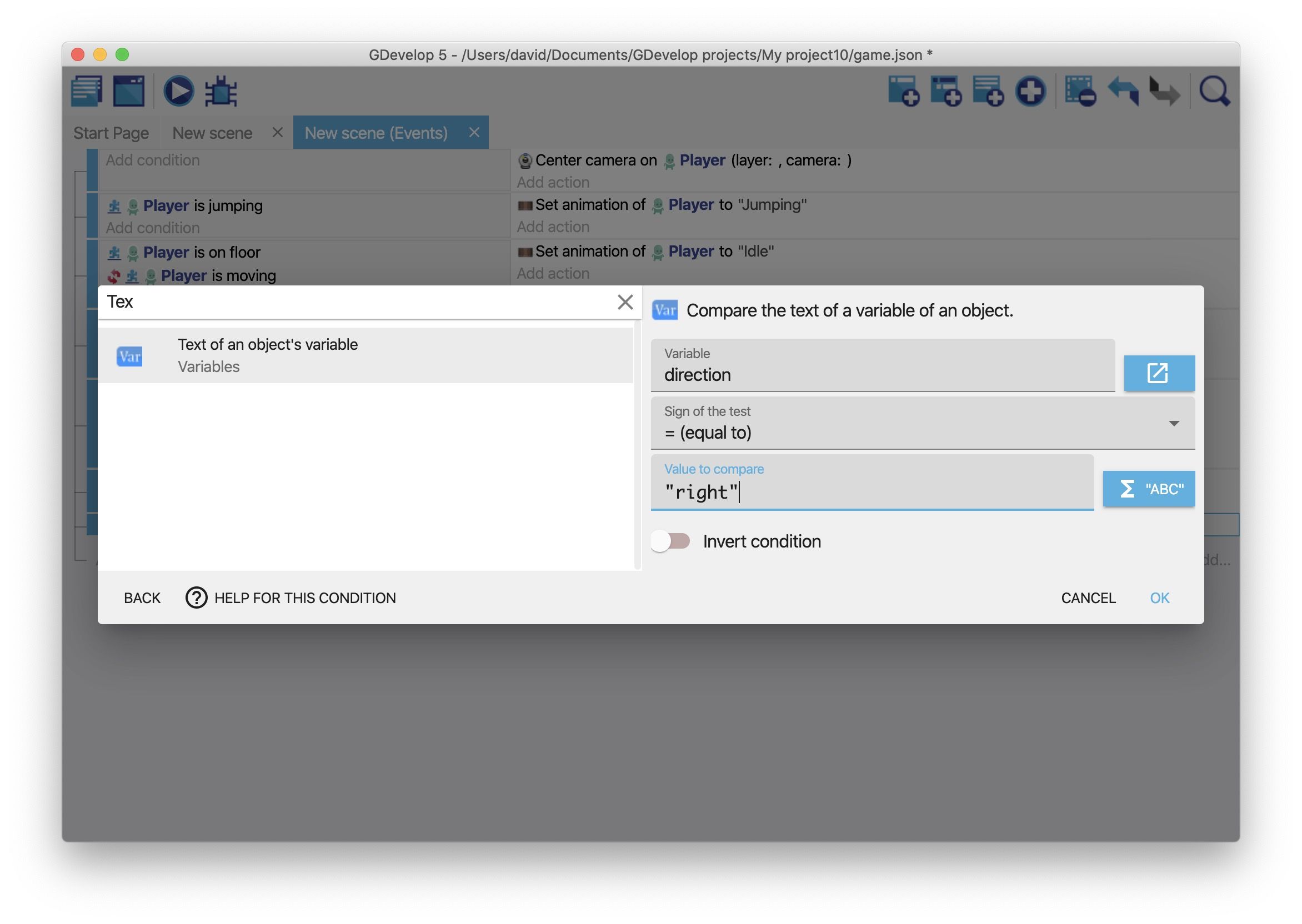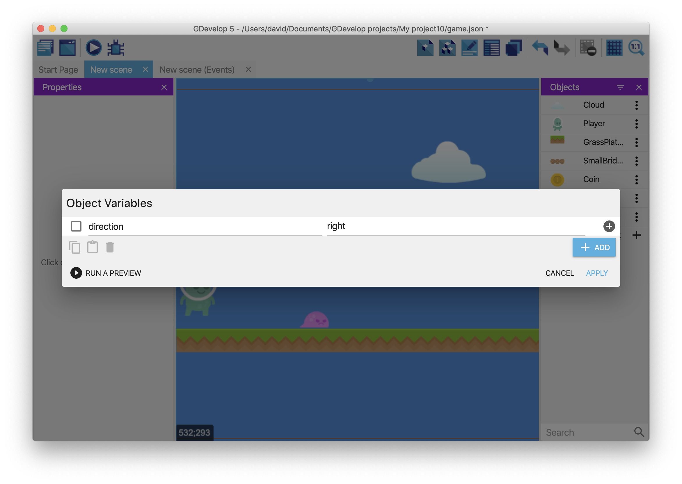 3. Add a variable named "direction" with a value of "right". This is the default value of the variable.