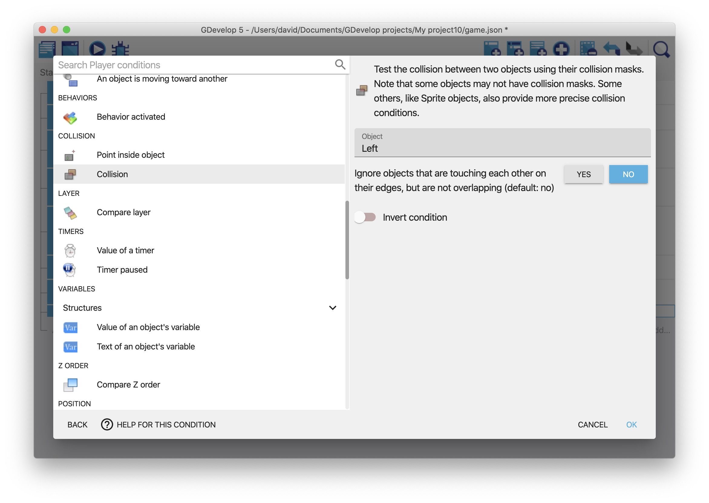 2. Add a Collision condition that checks if the "Slime" object is colliding with the "Left" object.